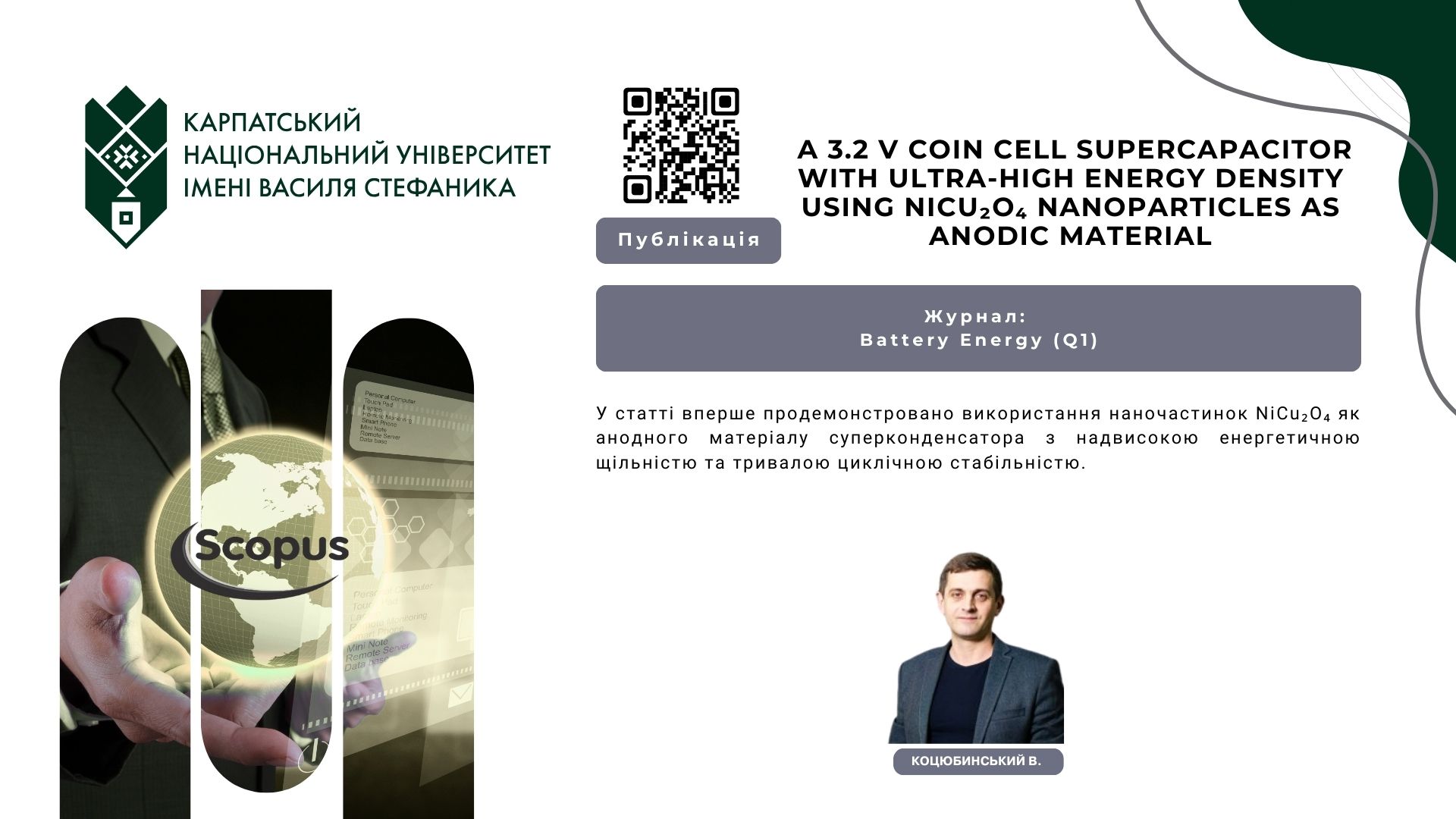 У статті вперше продемонстровано використання наночастинок NiCu₂O₄ як анодного матеріалу суперконденсатора з надвисокою енергетичною щільністю та тривалою циклічною стабільністю.
